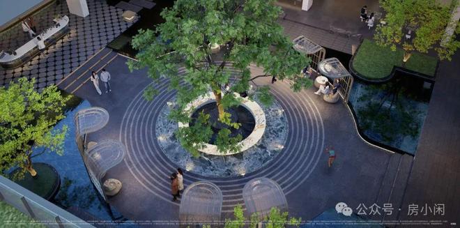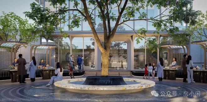 这个超奢门廊只是构成业主归家礼仪的一部分,进入大门后还有架空层合围成的下沉式庭院,分区设置成水院、邻里吧台、烟火集市和活水广场。